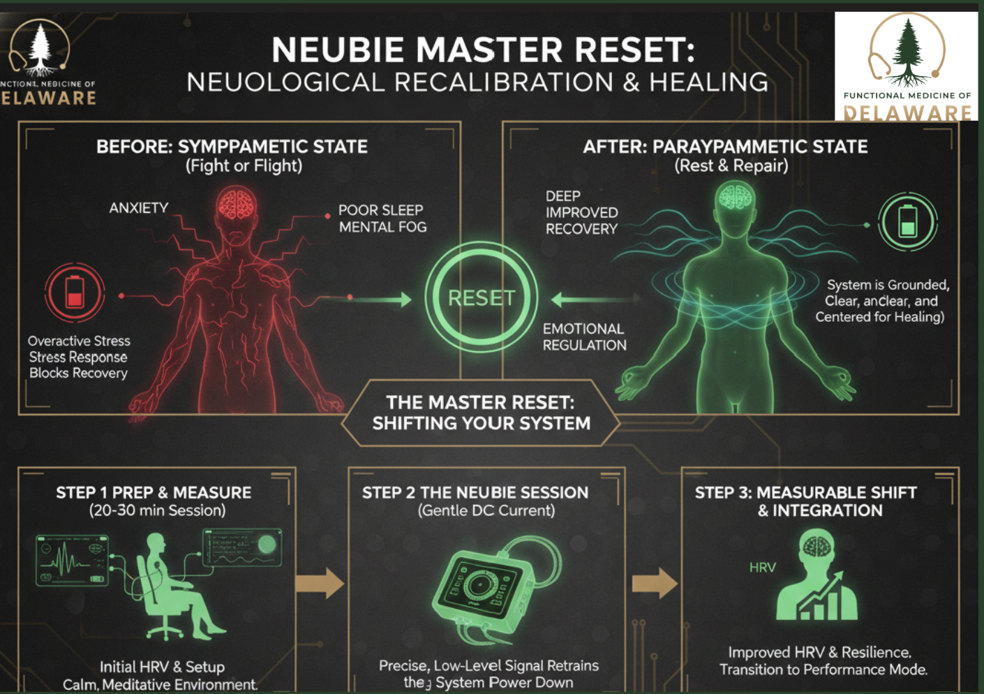 Rebalance your nervous system. Shift from stress to calm β in just one session. If you feel wired, exhausted, anxious, foggy, or stuck in constant βgo mode,β your nervous system may be stuck in fight-or-flight. The Master Reset is a gentle, science-backed neurological reset designed to help your body power down, recover, and restore balance.